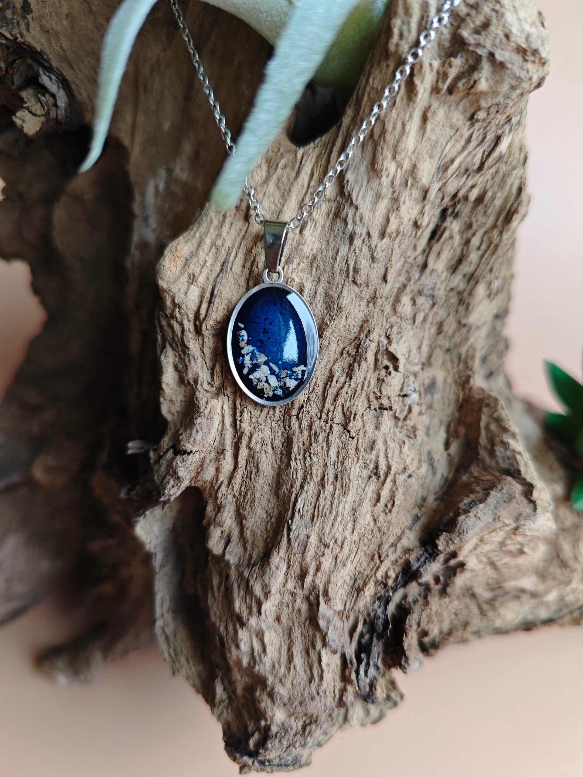 Een hanger met de as van Opa en Oma N met as, glitter en zand van de plek waar de as uit gestooid is.